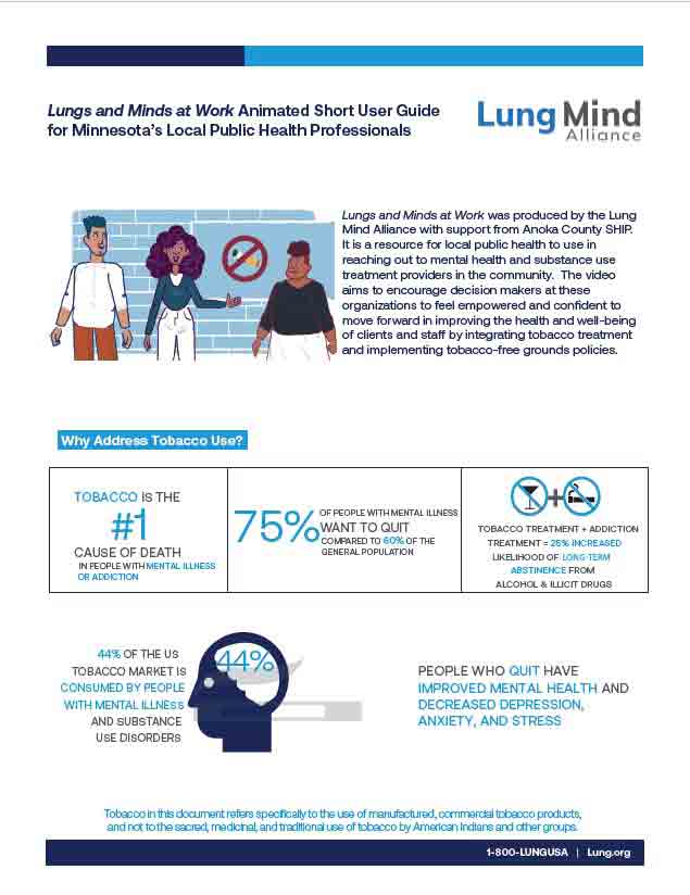 Lungs and Minds at Work is a resource to use in reaching out to mental health and substance use treatment providers. The video encourages decision makers to feel empowered and confident to move forward in improving the health and well-being of clients and staff by integrating tobacco treatment and implementing tobacco-free grounds policies.